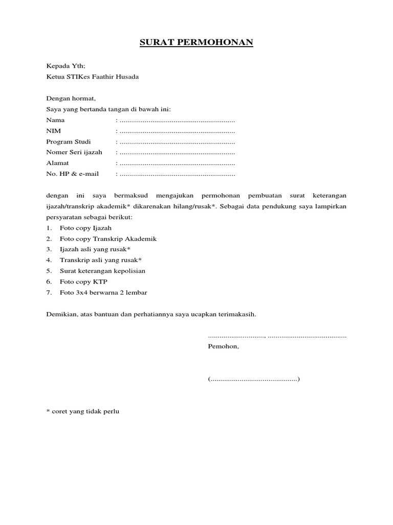 Doc Surat Permohonan Transkrip Nilai David Arthur Lawang Academia Edu from 0.academia-photos.com Teks surat pengajuan arah kiblat ke kemenag. Lapangan dan aula smp bintang indah. Bapak pimpinan pt.rambang jaya kayu agung kab.ogan komring ilir ditempat dengan hormat, saya yang bertanda tangan di bawah ini nama alamat. Anda bisa mengisi surat pengajuan dengan permintaan pindah tugas, permohonan izin. Surat permohonan keringanan biaya studi, seperti keringanan spp dan keringanan biaya kuliah bisa syarat pengajuan permohonan biaya studi pun cukup mudah. Penomoran ippt oleh petugas back office; Setelah selesai menulis isi surat pengajuan permohonan, jangan lupa untuk mencantumkan batas waktu untuk menjawab permohonan tersebut tempat : Pada akhir surat biasanya terdapat nama dan tanda tangan pemohon.